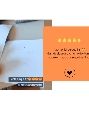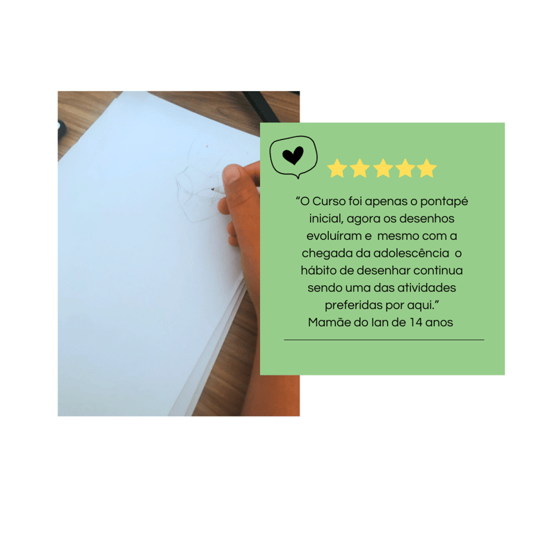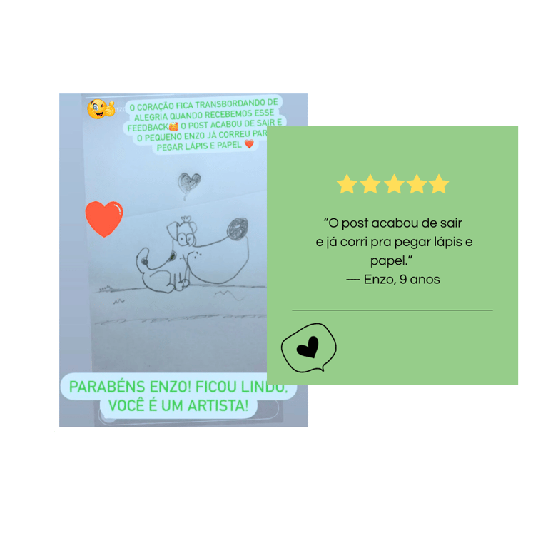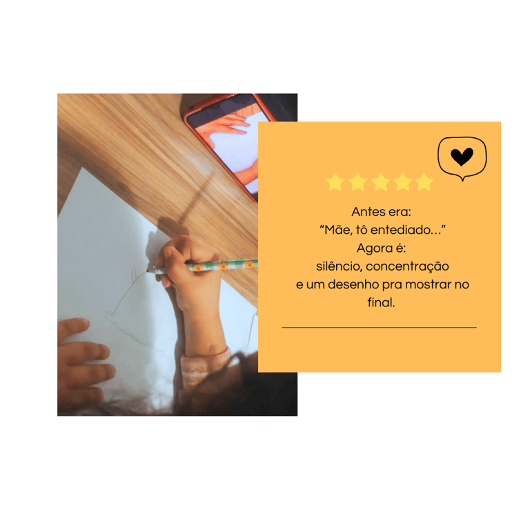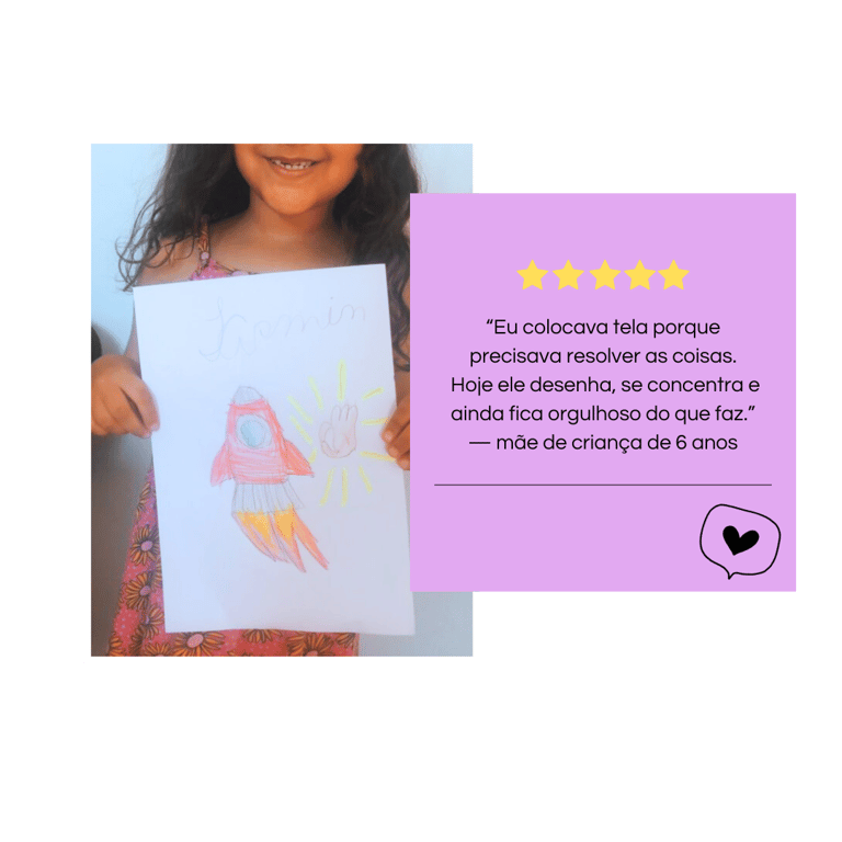O desenho prende a atenção, gera orgulho e motivação. A tela deixa de ser o centro — porque a criança quer continuar criando fora dela.